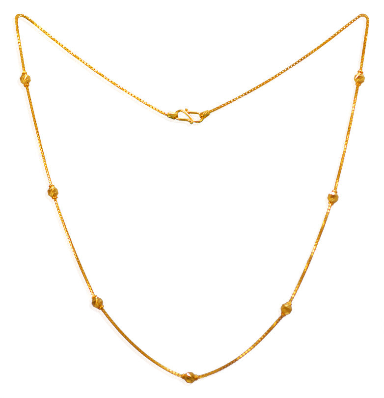 Elevate your jewelry collection with our exquisite 22Kt Pure Gold Box Chain, meticulously crafted with an elegant alternating beaded pattern. The stunning laser-cut shiny beads add a contemporary flair, making this versatile piece suitable for any occasion and effortlessly complementing all your outfits. Indulge in the luxury of this timeless accessory that combines modern design with classic elegance.