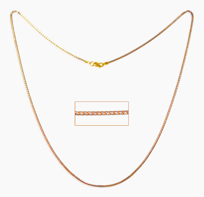 This Elegant 22Kt Gold Two Tone Snake Chain showcases a finely crafted round chain, where closely set, round links create a smooth, structured silhouette. The Rhodium finished polished surface catches the light beautifully, producing a soft, consistent sparkle along the entire length of the chain. Timeless and versatile , this piece works equally well worn alone for a clean, minimalist statement or layered with pendants and other chains for a more styled look.